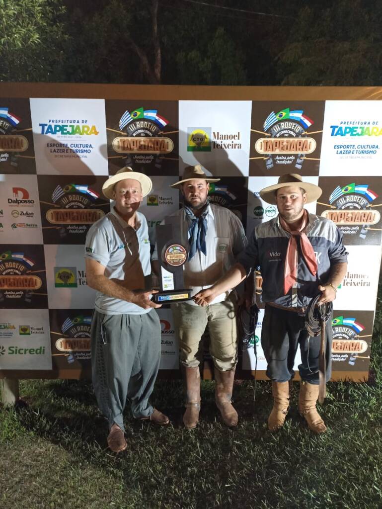 Roni Schwartz e Clรณvis Junior do Piquete de Laรงo Estรขncia do Laรงo โ Boa Vista das Missรตes e a dupla Otรกvio e Israel Freitas do Piquete de Laรงo Sebastiรฃo Luiz de รvila โ Passo Fundo venceram a disputa principal do III Rodeio Internacional de Tapejara, โTaรงa Patrรฃo Hugo Dalpossoโ. A entrega da premiaรงรฃo ocorreu no final da noite de domingo (22), encerrando o rodeio. A competiรงรฃo ainda consagrou vencedores de outras 26 modalidades.