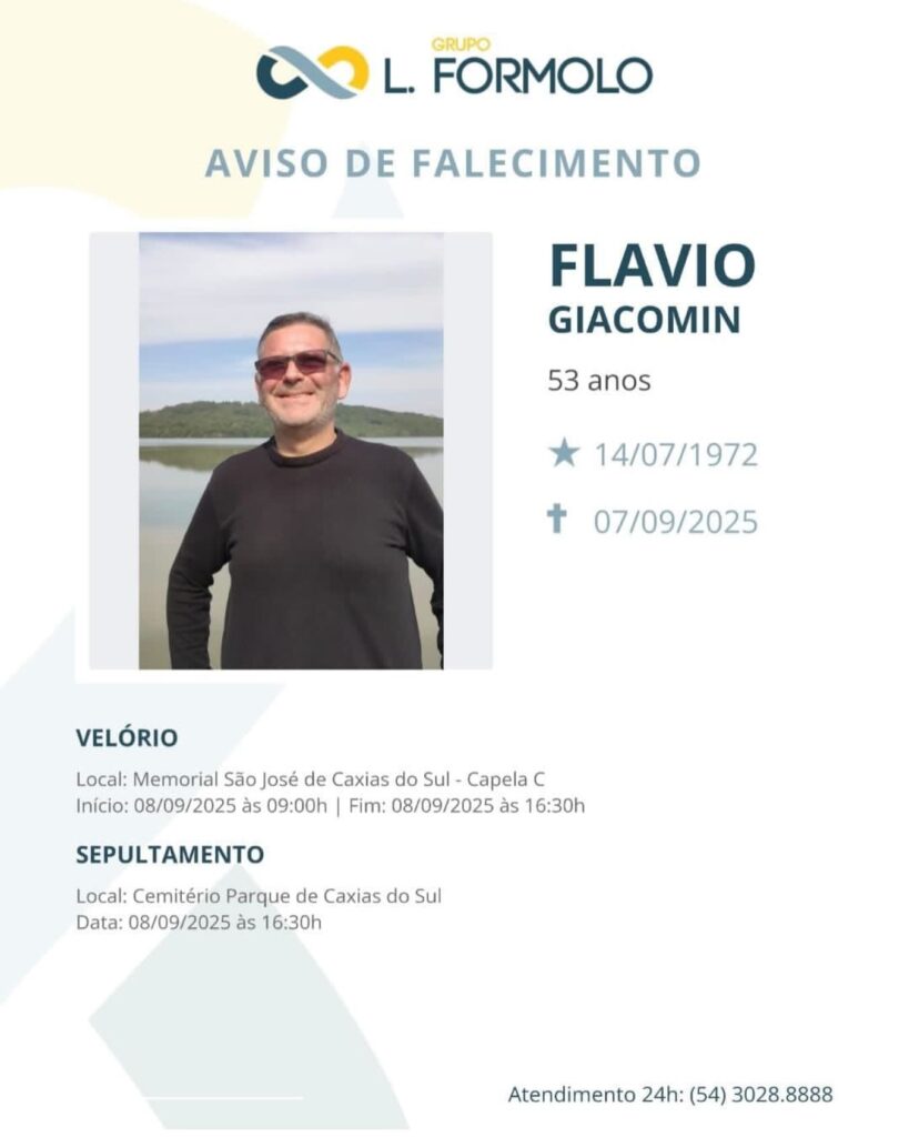 A família Giacomin, comunica com pesar, o falecimento de Flávio Giacomin – “Japonês”, ocorrido dia 07/09/2025 com 53 anos de idade. Seu corpo está sendo velado na Capela C do Memorial São José em Caxias do Sul – RS. Sepultamento às 16h30 do dia 08/07/2025 no Cemitério Parque de Caxias do Sul