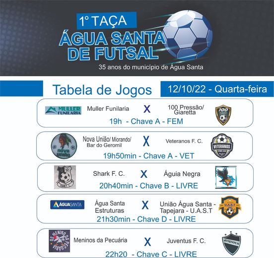 Hoje, 12 de outubro, acontece mais uma rodada da Taça Água Santa de Futsal – 35 anos de Água Santa. Venha até o Ginásio Municipal de Esporte para acompanhar os 05 jogos que marcarão essa noite de feriado nacional.