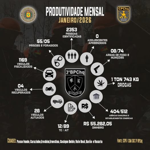 Durante o mês de janeiro de 2026, o 3º Batalhão de Polícia de Choque (3º BPChq) realizou ações de policiamento ostensivo e repressivo qualificado em diversos municípios da região norte do Estado.