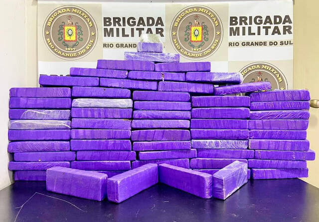 Foi realizada a abordagem na mulher na chegada do ônibus. Ela estava de posse das duas malas, sendo localizados no interior delas 58 tabletes e meio de maconha.