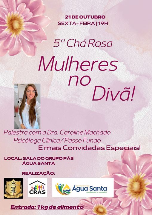 A Administração Municipal de Água Santa convida todas as mulheres água-santenses para participarem da 5ª Edição do CHÁ ROSA que acontecerá no dia 21 de outubro, às 19h, no Salão Paroquial. O Chá Rosa é um evento promovido pela Secretaria Municipal de Saúde, Secretaria Municipal de Assistência Social, Trabalho e Habitação, Centro de Referência de Assistência Social – CRAS e Exército de Ester’s.