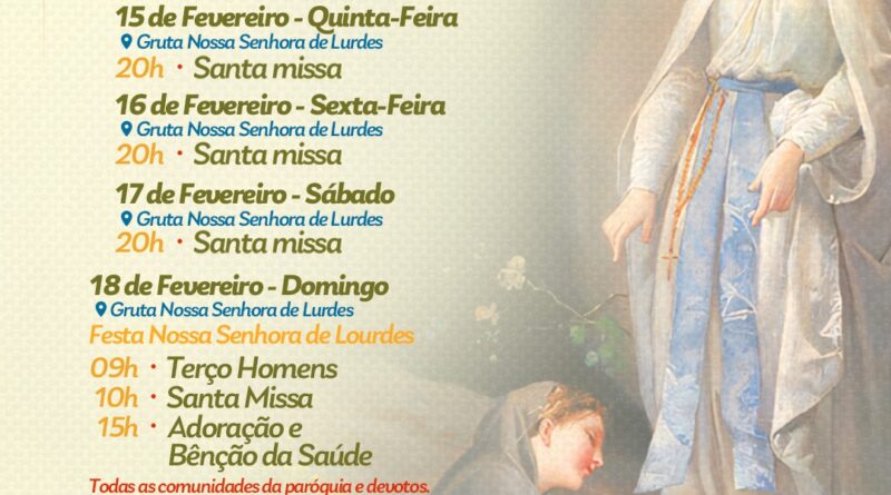 A PROGRAMAÇÃO INICIA NA QUINTA-FEIRA, DIA 15/02, COM TRÍDUO, QUE TERÁ INÍCIO ÀS 20H NA GRUTA E SE REPETIRÁ NAS NOITES DE SEXTA-FEIRA, 16/02 E SÁBADO 17/02. TAMBÉM SERÃO REALIZADAS MISSAS NA GRUTA ÀS 20H.