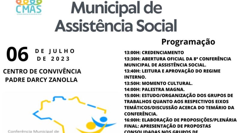 A Secretaria Municipal de Assistência Social, Trabalho e Habitação irá promover no dia 06 de julho, às 13h, no Centro de Convivência Pe. Darcy Zanolla, a 8ª Conferência Municipal de Assistência Social que terá como tema a “Reconstrução do SUAS: O SUAS que temos e o SUAS que queremos”.