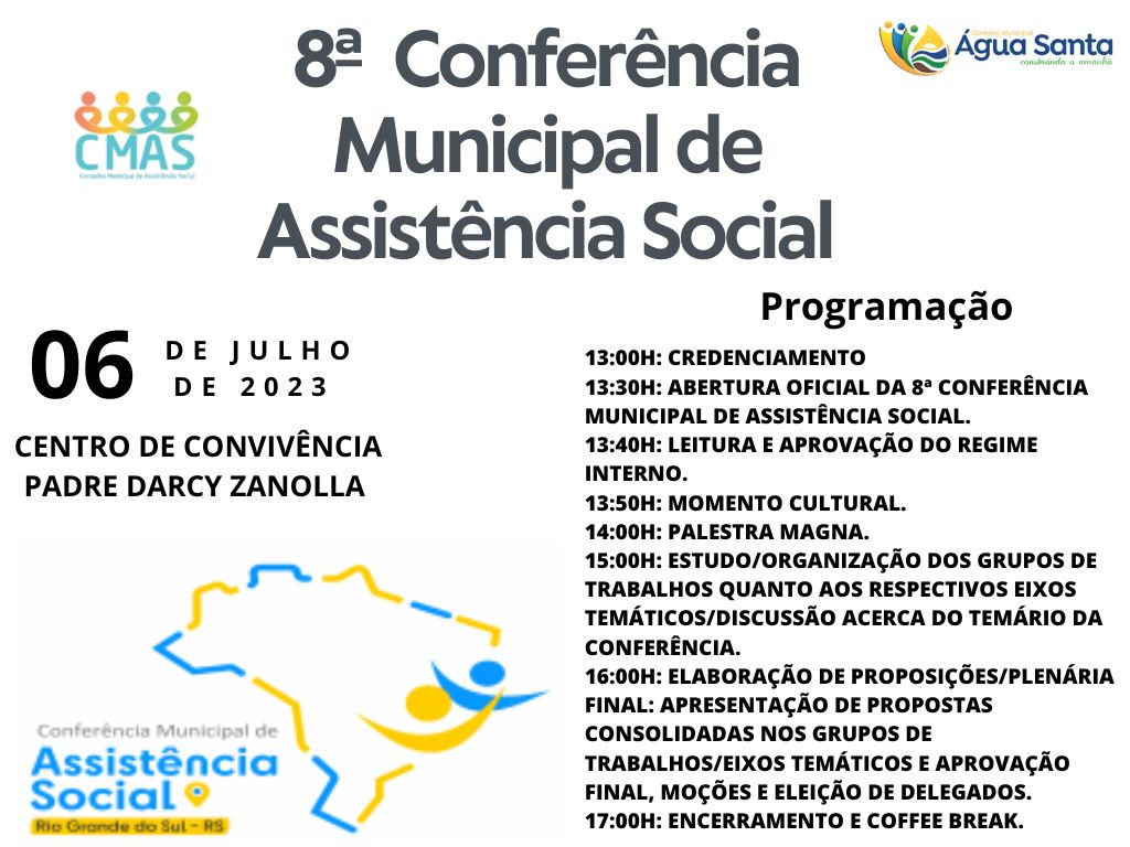 A Secretaria Municipal de Assistência Social, Trabalho e Habitação irá promover no dia 06 de julho, às 13h, no Centro de Convivência Pe. Darcy Zanolla, a 8ª Conferência Municipal de Assistência Social que terá como tema a “Reconstrução do SUAS: O SUAS que temos e o SUAS que queremos”.