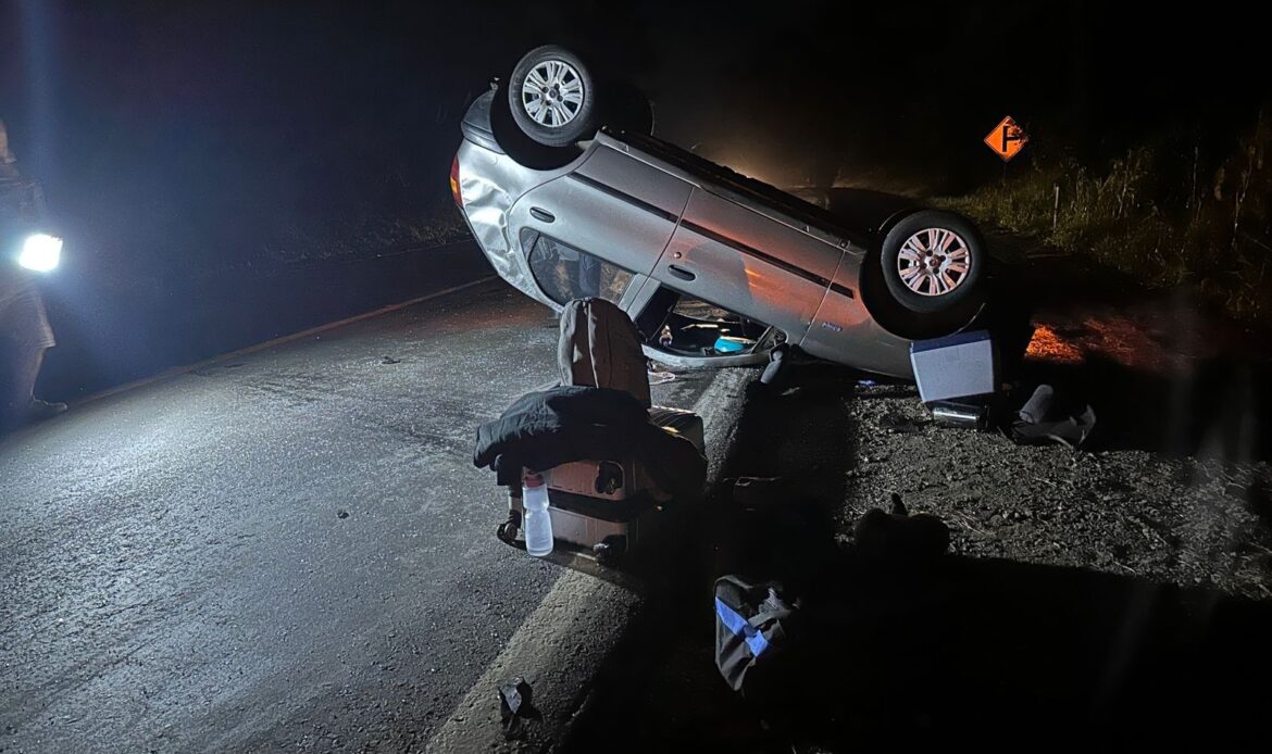 O condutor de um Fiat/Palio, que seguia no sentido Erechim, por motivos desconhecidos perdeu o controle da direção e capotou o veículo, parando sobre a pista.