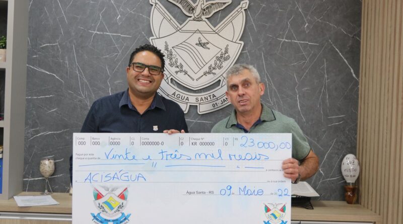 Na última segunda-feira, 09 de maio, o prefeito municipal, Eduardo Picolotto, recebeu em seu gabinete o presidente e da Associação Comercial, Industrial, de Serviços e Agropecuária de Água Santa, a Aciságua, Lacir Nervo, para a assinatura do Termo de Fomento que garante a transferência de valor para a Aciságua.Na ocasião o Governo Municipal repassou R$ 23 mil reais em recursos para a Associação para o ano de 2022.O valor destinado à entidade serve para auxiliar nas atividades desenvolvidas pela Associação, como a campanha Show de Prêmios que acontece anualmente no município. “Contribuir com a Aciságua é estar contribuindo com o nosso comércio, nossas indústrias e toda a nossa população, assim gerando desenvolvimento para Água Santa. Estamos à disposição da Associação para juntos alinharmos o desenvolvimento do nosso município”, comentou o prefeito municipal, Eduardo Picolotto.