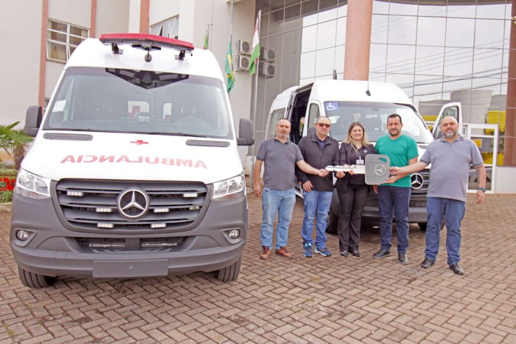 Numa das fotos aparecem o vice-prefeito Rodinei Bruel (Gipe) (de óculos), o secretário Dedé (de camiseta verde), o chefe de Gabinete, Rodrigo Dalmina (na ponta direita) e o coordenador dos motoristas da Saúde, Anderson Francisco Guadagnim. Entre eles, Keila, representante da Mercedes-Benz na região.