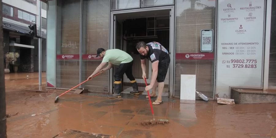 A chuva destruiu o interior de uma clínica odontológica, na esquina da avenida Benjamin Constant com a rua Alberto Torres, em Lajeado. O proprietário Itamar Santos aproveitou a baixa no Rio Taquari, que passou de 33 metros para 30, nesta sexta-feira, para retirar o barro que entrou junto com a água no estabelecimento.