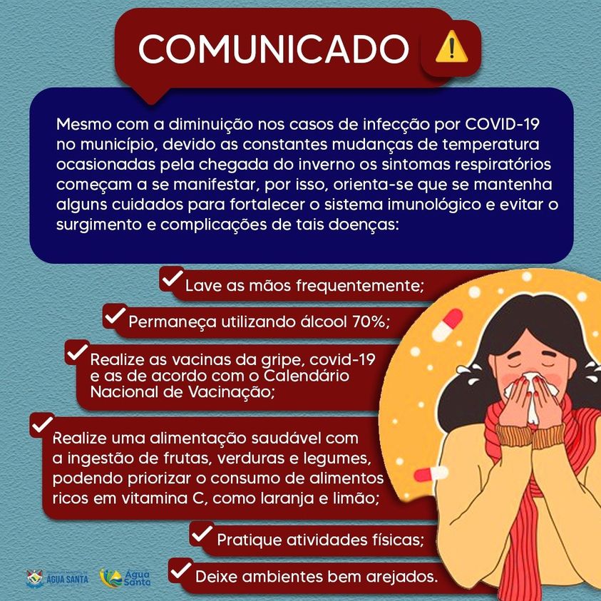 Com a chegada das baixas temperaturas se faz necessário que tenhamos alguns importantes cuidados com a nossa saúde. Por isso, a Secretaria Municipal de Saúde de Água Santa orienta que se mantenham alguns cuidados para fortalecer o sistema imunológico e evitar o surgimento e complicações de doenças respiratórias. Os cuidados básicos como lavar as mãos frequentemente e fazer a utilização de álcool em gel, manter a caderneta de vacinação atualizada realizando a as vacinas da gripe e da COVID-19, manter os ambientes arejados, praticar atividades físicas, assim como manter uma alimentação saudável são imprescindíveis para fortalecer o sistema imunológico.São ações simples que fazem a diferença. Cuide-se!
