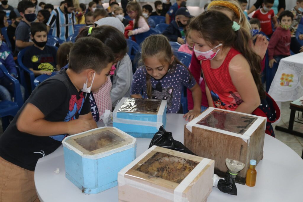 E nem sobre zangão, embora esse texto seja sobre abelha sem ferrão. Ontem, 30 de março, em uma parceria que deu certo e ainda renderá muitos frutos, ou muito mel, a Secretaria Municipal de Educação e Cultura e a Secretaria Municipal de Agricultura e Meio Ambiente, juntamente com o Centro de Tecnologia de Alternativas Populares – CETAP realizaram uma troca de conhecimento com os alunos do 1º Ano ao 9º Ano da Escola Municipal de Ensino Fundamental Padre Raimundo Damin. Na ocasião, os alunos participaram de uma oficina de abelhas nativas sem ferrão, mais conhecidas como ABELHAS-MIRINS. Conversaram com os alunos o gestor ambiental e assessor técnico do CETAP, Rudian Martini e a agrônoma e assessora técnica do CETAP, Diulie Almansa da Costa, na oportunidade, trocaram valiosas informações sobre as abelhas, onde falaram sobre o comportamento e a formas em que cada espécie de abelha trabalha na construção de favos e tipos de mel produzidos em cada colmeia.O secretário de agricultura e meio ambiente, Jairo Rodigheri, disse que esse projeto busca levar conhecimento sobre as abelhas-mirins aos alunos da rede municipal e que através deles as famílias possam ser impactadas e que possam aprender mais sobre o cultivo dessas abelhas. “Agradecemos o empenho da equipe do CETAP em trazer esse assunto aos alunos do nosso município e também agradeço a Secretaria de Educação por essa parceria que, com certeza, fará diferença na vida das pessoas”. A secretária de educação e cultura, Andriessa de Moraes de Souza comentou que essa parceria com a Secretaria de Agricultura só tem a agregar na vida dos estudantes da rede pública. “Estamos alinhados no mesmo proposito que é levar conhecimento aos nossos alunos, agradeço a toda equipe da Secretaria de Agricultura e do CETAP por essa linda parceria”. No dia 07 de abril na Praça Central Avelino Júlio Pimentel, o CETAP juntamente com a Cooperativa de Apicultores de Água Santa, EMATER, Sindicato dos Trabalhadores e Secretaria de Agricultura e Meio Ambiente, estará realizando um evento de inauguração de um Meliponário Comunitário Urbano de Abelhas Nativas sem Ferrão. Em breve traremos mais informações sobre o assunto.