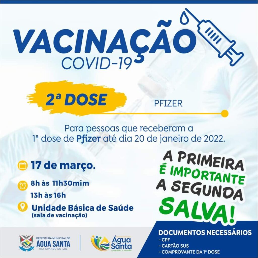 A Secretaria Municipal de Saúde de Água Santa estará realizando HOJE, QUINTA-FEIRA, 17 de março, a 2ª DOSE da vacina da PFIZER para quem fez a 1ª dose até 20 de janeiro de 2022.