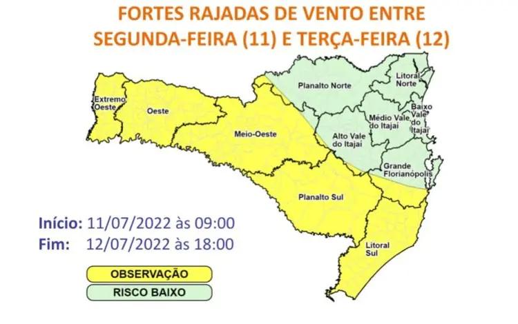 Conforme o órgão, a partir da manhã de segunda-feira o vento — que sopra do quadrante Norte/Noroeste — deve se intensificar. A velocidade média fica entre 10 km/h e 30 km/h, mas com rajadas que variam entre 50 km/h e 70 km/h em áreas do Oeste e Sul catarinense.