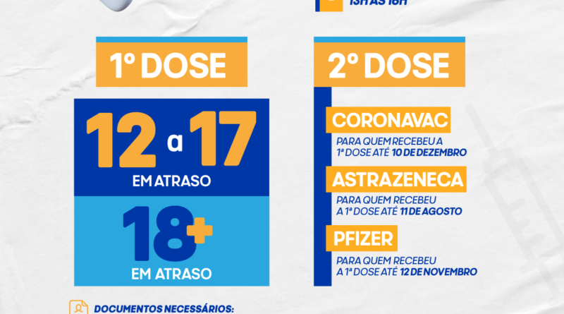 LEMBRETE: Levar documento com CPF, cartão SUS e comprovante da segunda dose, dose única ou caderneta de vacinação.