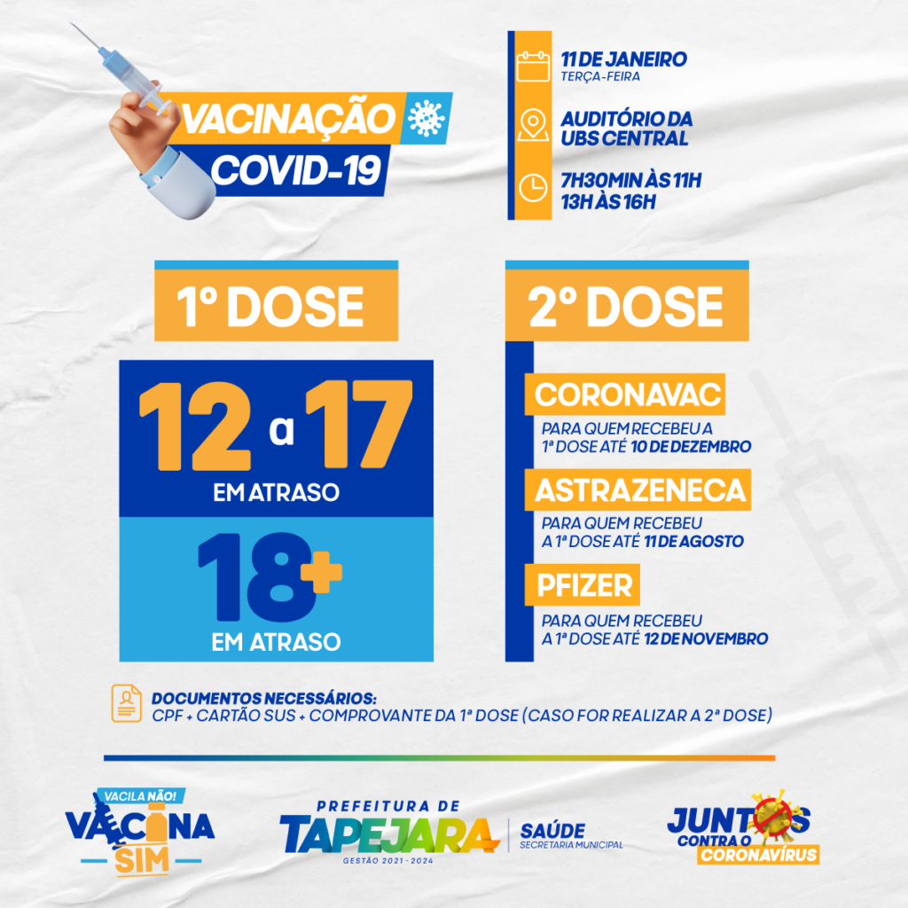 LEMBRETE: Levar documento com CPF, cartão SUS e comprovante da segunda dose, dose única ou caderneta de vacinação.