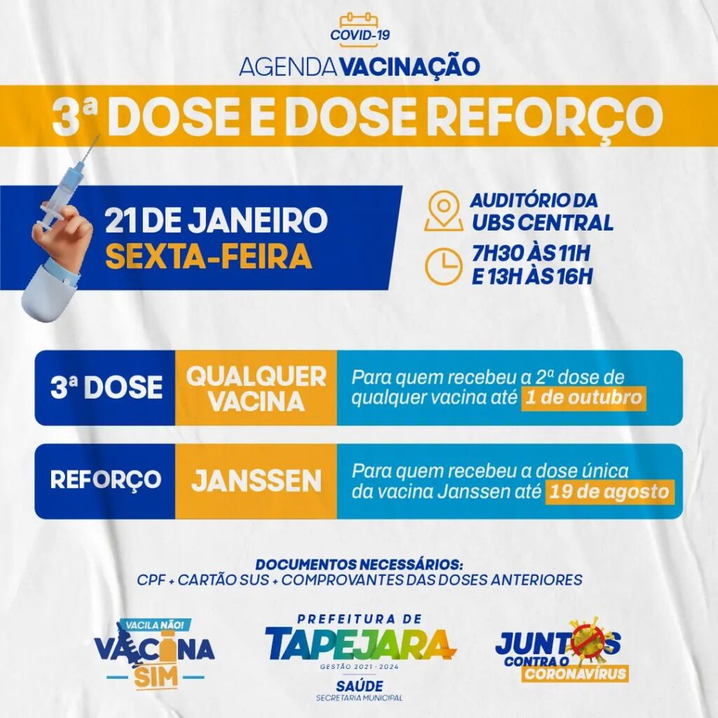 A Secretaria de Saúde de Tapejara promove nesta sexta-feira (21) a aplicação da 3ª dose da vacina contra a Covid-19 para pessoas que receberam a segunda dose de qualquer imunizante até o dia 1º de outubro. Também haverá reforço para pessoas vacinadas com a dose única da Janssen até 19 de agosto.