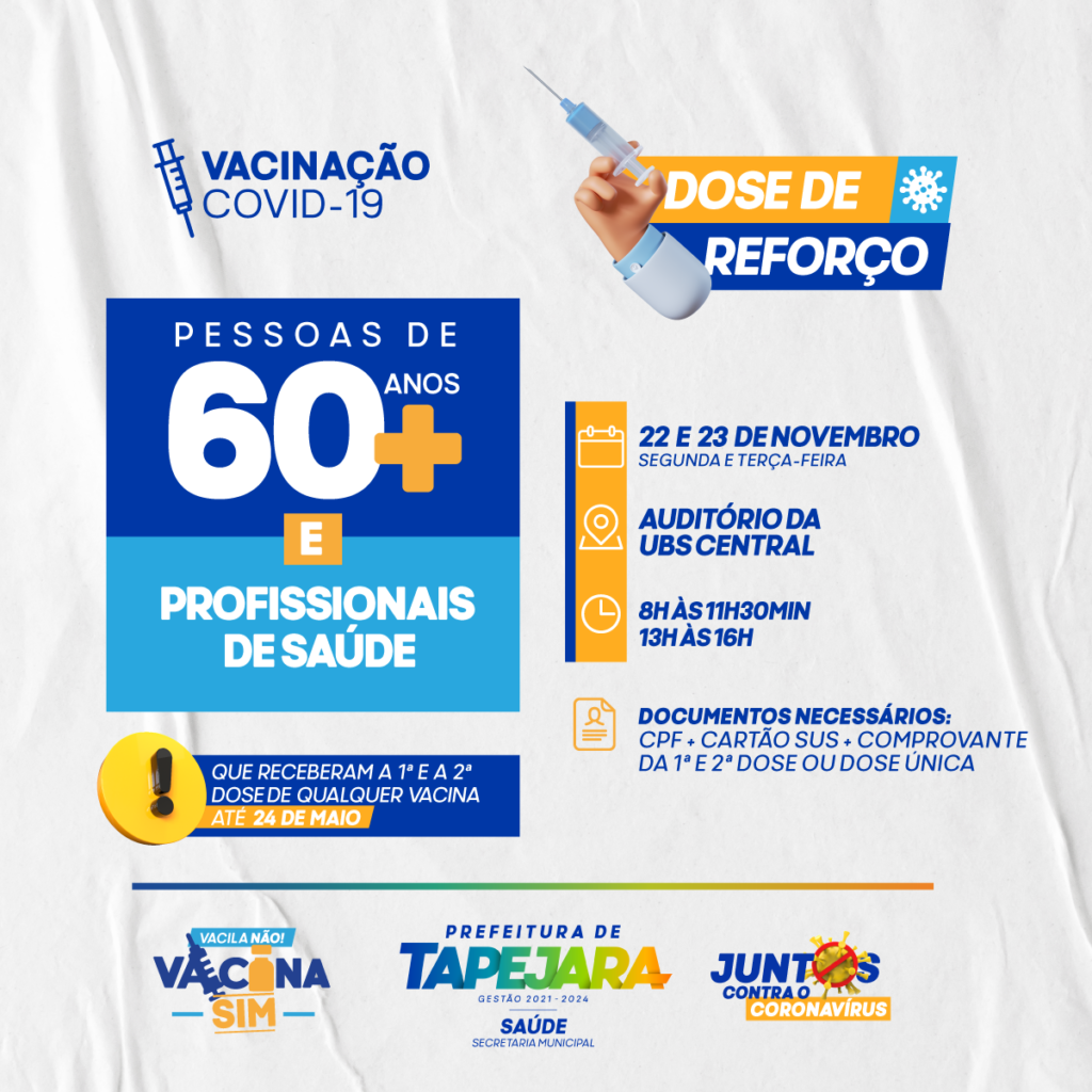 A Secretaria de Saúde de Tapejara promove nesta segunda-feira (22/11) e terça-feira (23/11), a vacinação da dose de reforço para profissionais da saúde e pessoas com 60 anos ou mais que receberam a segunda dose de qualquer vacina contra a covid-19 até o dia 24 de maio.