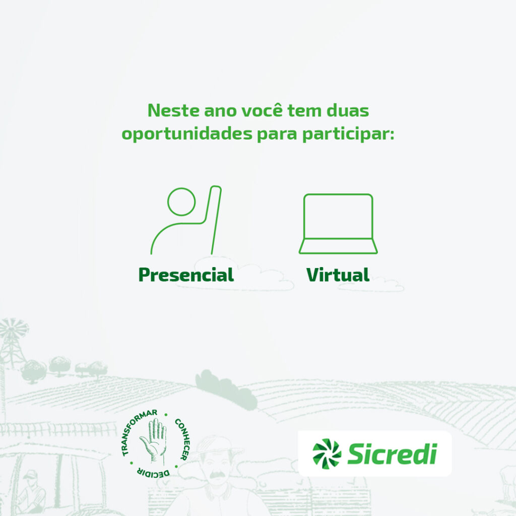 Neste ano você tem duas oportunidades de participar: presencial e virtual. Em qualquer um dos formatos escolhidos, você poderá definir, por meio do voto, o futuro da nossa Cooperativa.