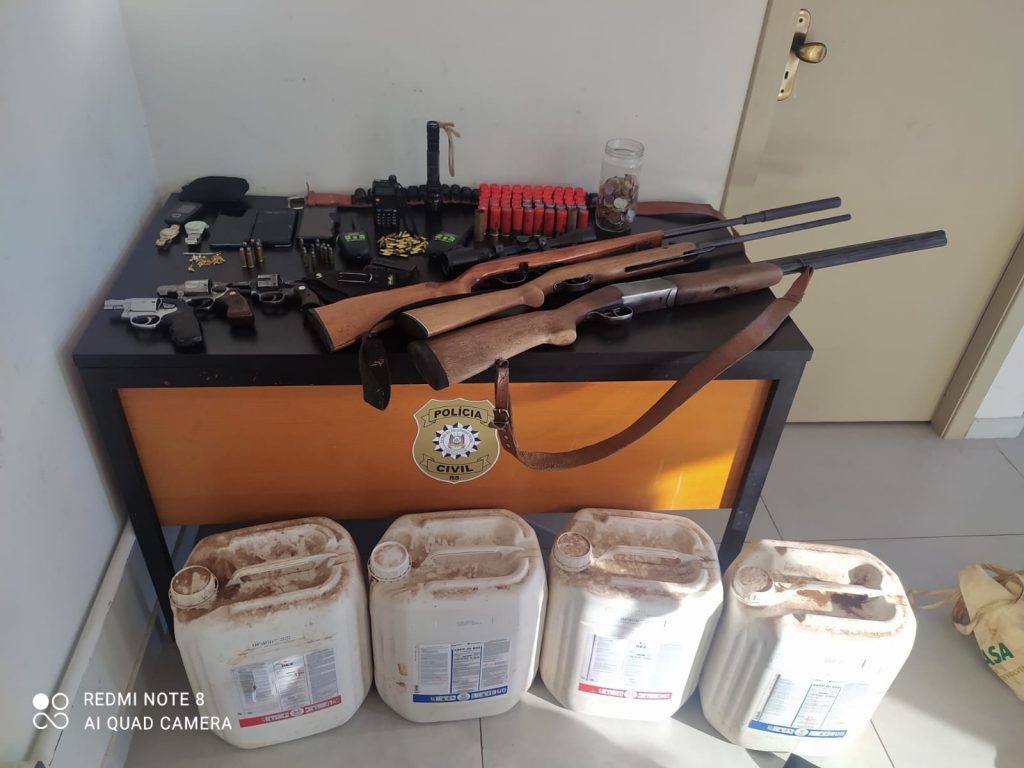 As demais guarnições se aproximaram do local e realizaram buscas, sendo localizadas duas mochilas. Dentro delas foram localizados dois revólveres carregados, munição de calibre 12 e diversos pertences das vítimas do roubo. No interior da casa foram localizadas uma carabina .22 marca CBC, um revólver cal .38 e diversas munições.