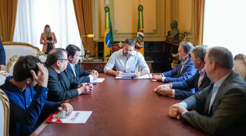 O governador Eduardo Leite assinou, nesta quinta-feira (13), no Palácio Piratini, a ordem de início para as obras de reconstrução do trecho de 100 metros no km 88 da ERS-129, em Muçum, que desmoronou em virtude das chuvas no Vale do Taquari.
