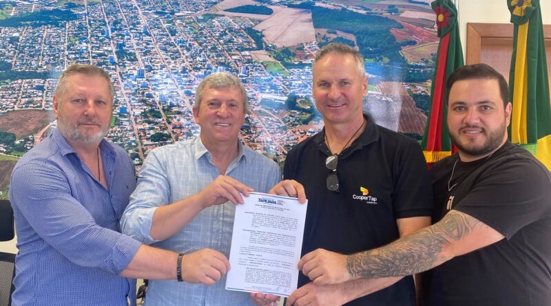 A assinatura do Termo de Concessão de Direito Real de Uso, a título gratuito, realizada na manhã desta segunda-feira (15), entre a Prefeitura de Tapejara e a Cooperativa dos Transportadores de Tapejara Ltda. (Coopertap), formaliza a destinação de uma área pública para uso da cooperativa. O ato contou com a presença do prefeito Evanir Wolff (Big), do presidente da Coopertap, Artemio Dalmina, do secretário de Desenvolvimento Econômico, Inovação e Tecnologia, Claudeomiro Sossella, e do coordenador da pasta, Dionattan Mezzomo.