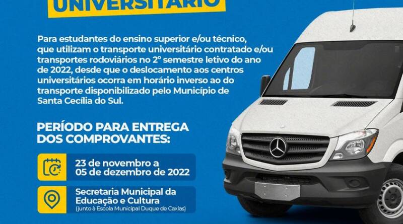 Para estudantes do ensino superior e/ou técnico, que utilizam o transporte universitário contratado e/ou transportes rodoviários no 2º semestre letivo do ano de 2022, desde que o deslocamento aos centros universitários ocorra em horário inverso ao do transporte disponibilizado pelo Município de Santa Cecília do Sul.