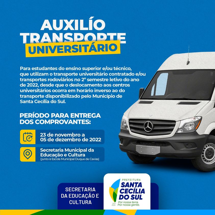Para estudantes do ensino superior e/ou técnico, que utilizam o transporte universitário contratado e/ou transportes rodoviários no 2º semestre letivo do ano de 2022, desde que o deslocamento aos centros universitários ocorra em horário inverso ao do transporte disponibilizado pelo Município de Santa Cecília do Sul.