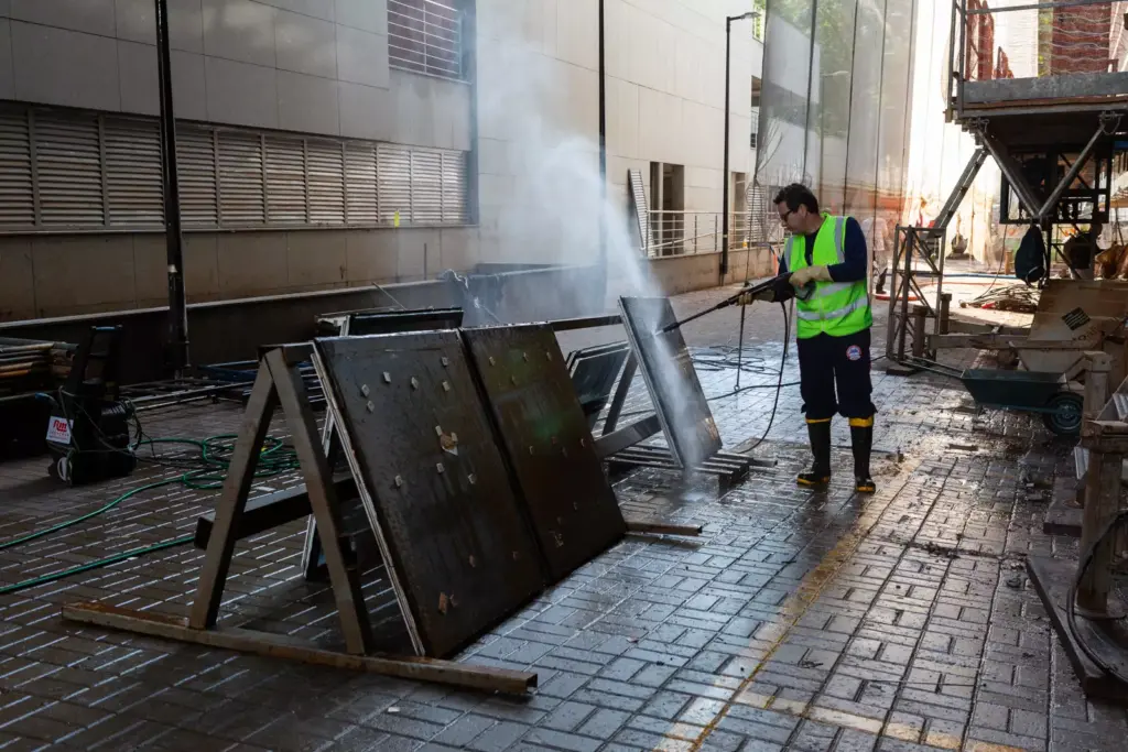 Equipamentos e móveis danificados foram removidos para descarte. Os avanços na reconstrução incluem a recuperação das bombas próprias de drenagem e a lavagem com hidrojatos para remoção da lama e lodo de pisos e paredes.