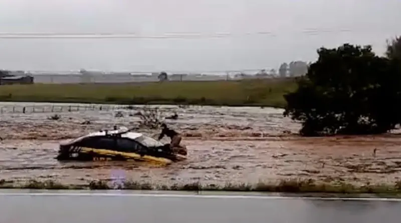 Vídeos postados nas redes sociais mostram veículos sendo arrastados pela força da correnteza, inclusive uma viatura da Polícia Rodoviária Federal. Nas imagens é possível ver que um agente está em cima do carro.