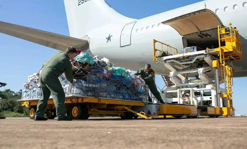 Nesta segunda, a aeronave KC-30, da Força Aérea Brasileira (FAB), chegou em Canoas com cerca de 18 toneladas de mantimentos doados.