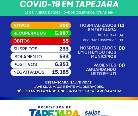 Atualização da situação dos casos de Coronavírus em Tapejara no dia 16 de janeiro de 2022.