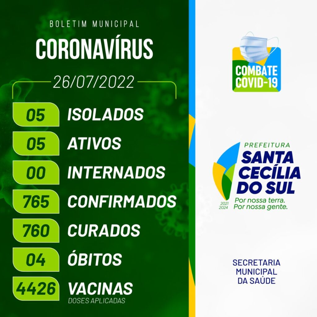 Boletim epidemiológico de Santa Cecília do Sul com dados apurados dia 26/07/2022