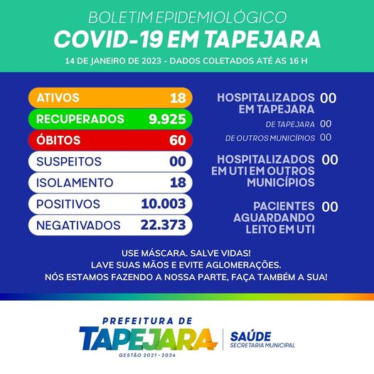 Atualização da situação dos casos de Coronavírus em Tapejara no dia 14 de janeiro de 2023. Não descuide. A pandemia não acabou!