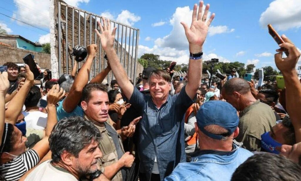 Bolsonaro esteve na cidade de Açailândia (MA) para entregar 287 títulos de propriedade rural no dia 21 de maio deste ano. Como de costume, ao chegar ao local, o presidente, sem máscara, cumprimentou apoiadores que se aglomeravam atrás de uma grade de proteção. No discurso, ele fez críticas ao governador e seu adversário político Flávio Dino, na época no PCdoB, e perguntou para a plateia quem era “o gordinho ditador do Maranhão”.