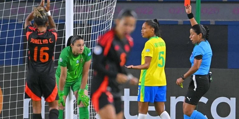 A resposta da Colômbia foi imediata e o primeiro gol só não saiu porque Lorena fez grande defesa. Aos 24 minutos, o lance que mudou o panorama do jogo. Lorena cortou fora da área um chute de Caicedo com o braço esquerdo e foi expulsa.
