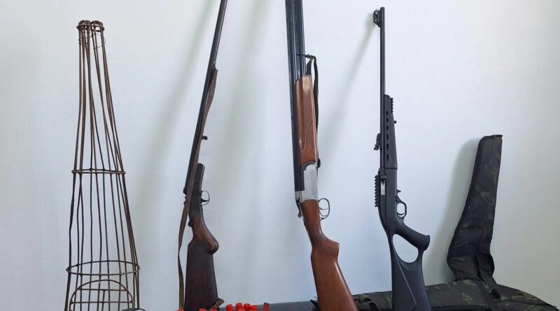 Durante a abordagem, foram encontradas dentro de um dos veículos uma espingarda calibre 12 e um rifle calibre 22, ambos sem registro. Já no interior do galpão, os policiais localizaram uma pistola artesanal adaptada para calibre 22 e uma espingarda calibre 28, também sem identificação, além de 103 munições de calibre 22, 13 munições de calibre 12 e 3 munições de calibre 28.