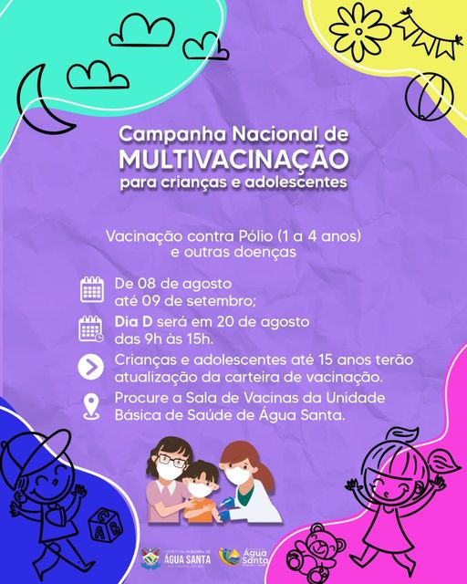 A Secretaria Municipal de Saúde de Água Santa informa que de 08 de agosto a 09 de setembro acontece a Campanha Nacional de Multivacinação para crianças e adolescentes.
