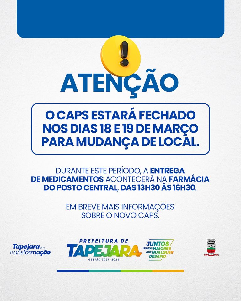 Prefeitura de Tapejara informa que o CAPS está mudando de endereço para aprimorar nosso atendimento.