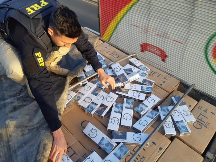 Em operação de combate ao crime, Policiais Rodoviários Federais abordaram uma carreta com placas de Santa Catarina. Logo no início da abordagem, os policiais constataram que o caminhão trator e os dois semirreboques estavam com placas falsas. Durante as buscas, os policiais verificaram que a carreta estava abarrotada de cigarros de origem paraguaia.