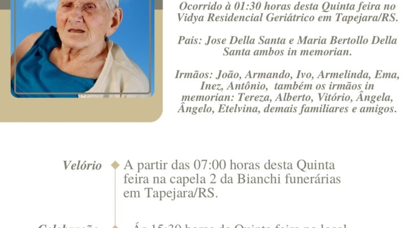 Read MoreA Bianchi Funerárias, juntamente com a família Della Santa, comunica com pesar, o falecimento de Joana Della Santa, ocorrido à 01h30