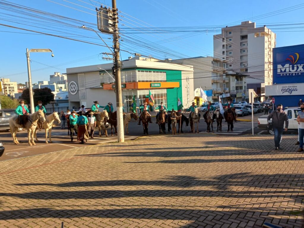 As 17:00 horas desta segunda-feira, 30 de agosto, 16 cavalarianos, que estiveram acompanhados de mais 6 pessoas no apoio, percorreram cerca de 140 km a cavalo na busca da Chama Crioula trouxeram a Chama Crioula em frente a Prefeitura de Tapejara.