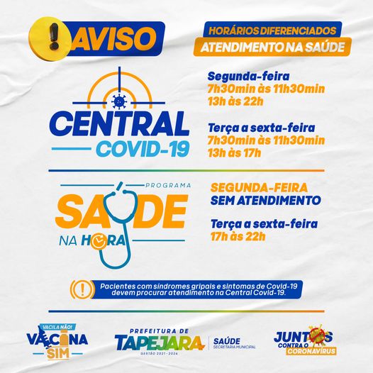 A Secretaria de Saúde informa que, a partir desta segunda-feira (07), haverá novos horários de atendimento na Central Covid-19 e no Programa Saúde na Hora. Estes horários podem ser alterados conforme mudanças no cenário epidemiológico do município.