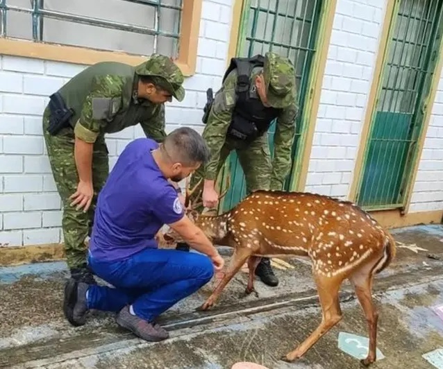 A equipe de resgate foi acionada por moradores da região, que perceberam o mamífero assustado com cães enquanto andava na cidade. Atordoado, o cervo acabou entrando no pátio do colégio.