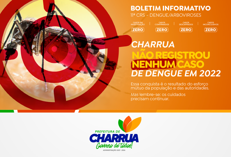 Os dados foram divulgados no boletim Informativo de Dengue/Arboviroses da 11ª CRS – Região de Saúde 16, seguindo os dados oficiais informados no SINAN on-line (Sistema de Informação de Agravos de Notificação do SUS).O boletim, que registra os casos de Dengue e outras arboviroses dos Municípios de abrangência da 11ª CRS, registrou 190 casos suspeitos de Dengue, sendo 10 casos confirmados, em 2022, até a Semana Epidemiológica 9 (SE 9).O Município de Charrua não possui nenhum caso ativo e nenhuma suspeita até o momento, porém é necessário manter o cuidado, evitando deixar água parada para possíveis criadouros do inseto.