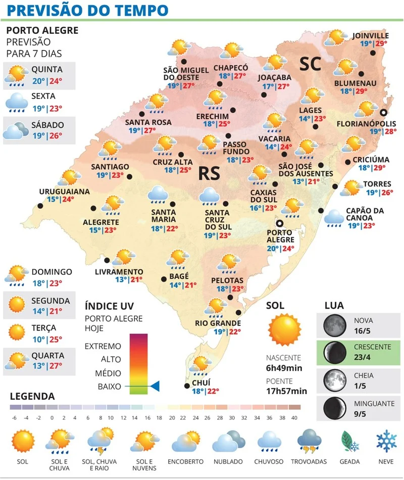 Devido à influência de uma frente fria associada a um ciclone no Atlântico Sul, o tempo fica instável e com chuva em grande parte do Rio Grande do Sul nesta quinta-feira, 23. A exceção fica por conta de pontos mais ao Oeste e ao Sul do estado.