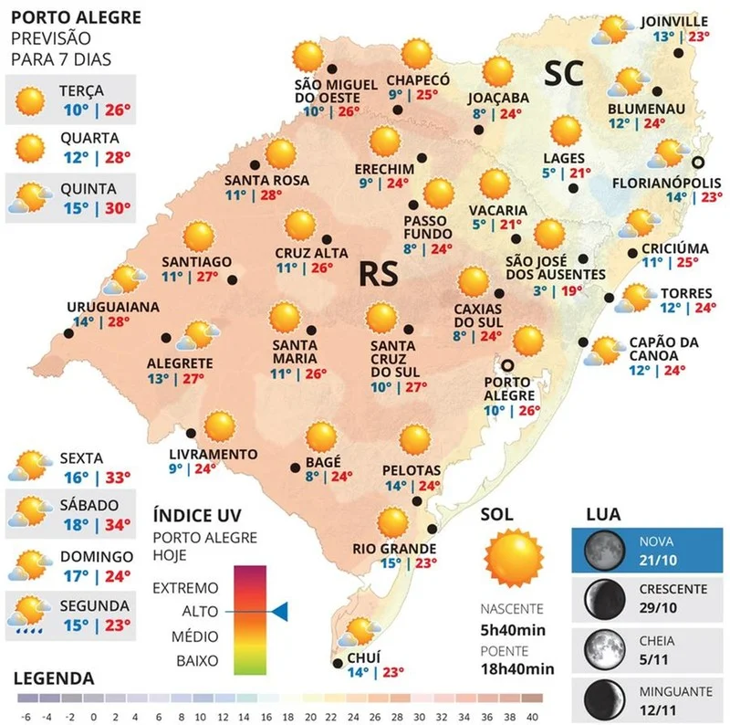 O tempo aberto da madrugada, sob a influência de um centro de alta pressão no Atlântico, volta a proporcionar resfriamento maior com mais um amanhecer de temperatura baixa no estado para a época do ano. Em Ausentes as marcas variam entre 3ºC e 19ºC, enquanto em Bagé fica entre 8ºC e 24ºC. Já em Porto Alegre a temperatura oscila entre 10ºC e 26ºC.