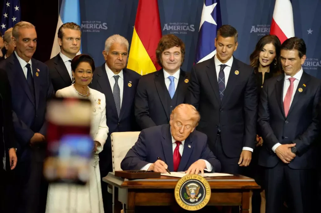 O presidente dos Estados Unidos, Donald Trump, anunciou a coalizão entre países da América Latina para combater cartéis. O republicano recebeu, neste sábado (7), líderes latinos para o evento batizado como “Escudo da América”. “Vamos fazer coisas incríveis, a região de vocês foi abandonada pelos EUA, que olhou para regiões em que nem era bem recebido”, disse o presidente.