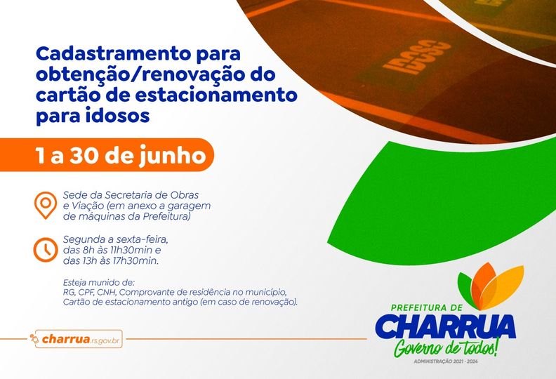 Inicia hoje, quarta-feira, dia 1º, e vai até o dia 30 de junho, o cadastramento de idosos que precisam adquirir ou renovar o cartão de estacionamento. O documento é uma autorização para o estacionamento de veículos conduzidos por idosos, nas vagas sinalizadas com a inscrição “Idoso”, e têm direito a ele, todas as pessoas com idade igual ou superior a 60 anos.