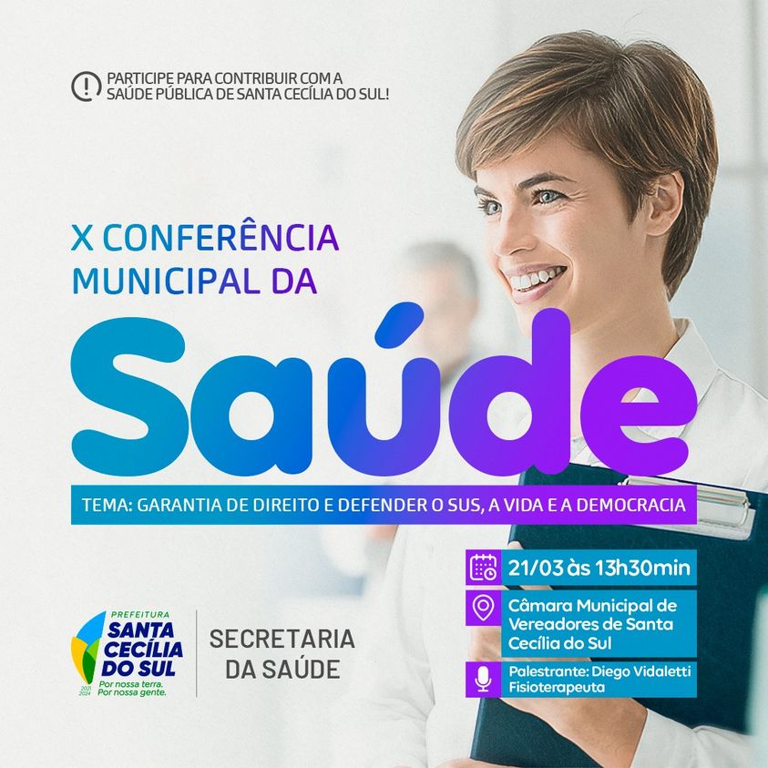 O Conselho Municipal da Saúde e a Secretaria da Saúde de Santa Cecília do Sul convidam a todos para a X Conferência Municipal da Saúde, que acontecerá no dia 21 de março, às 13h30min na Câmara Municipal de Vereadores.