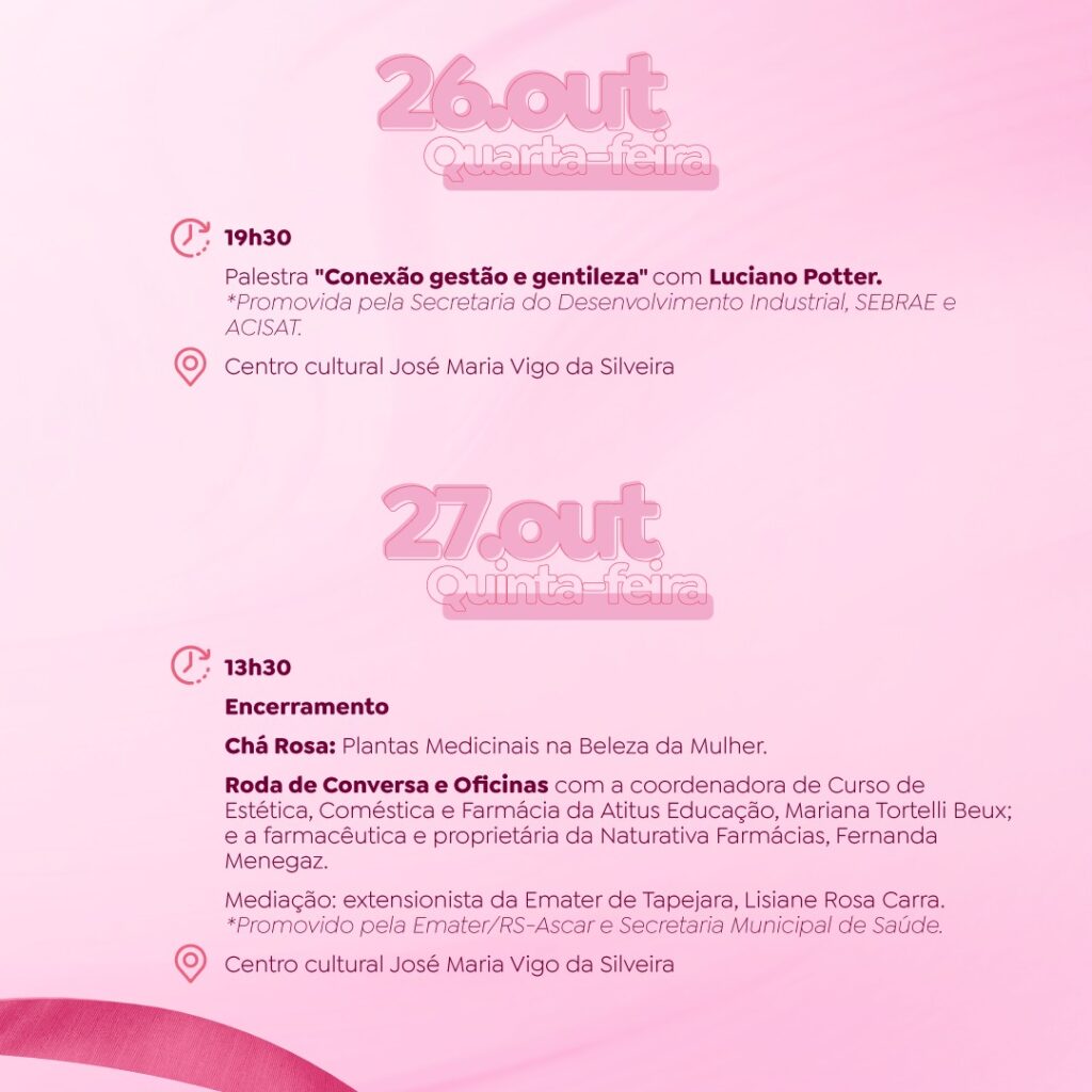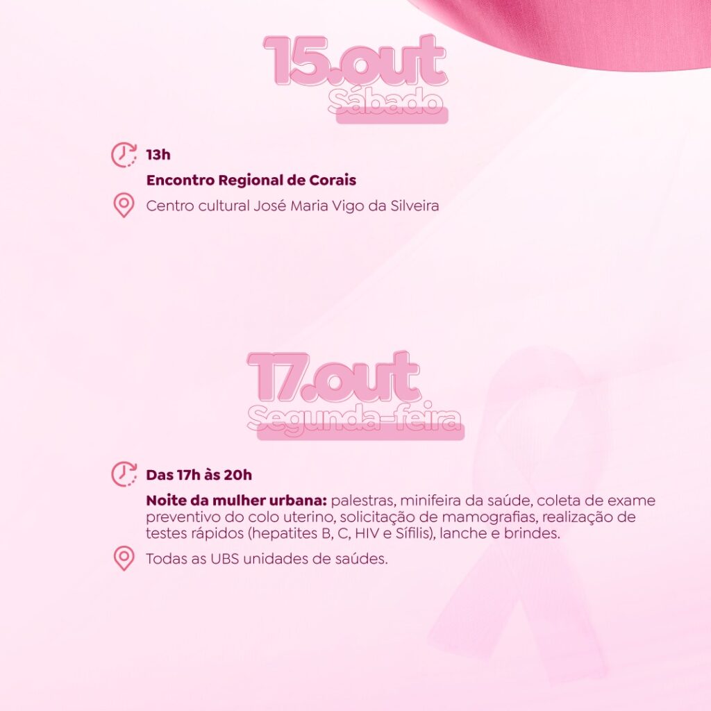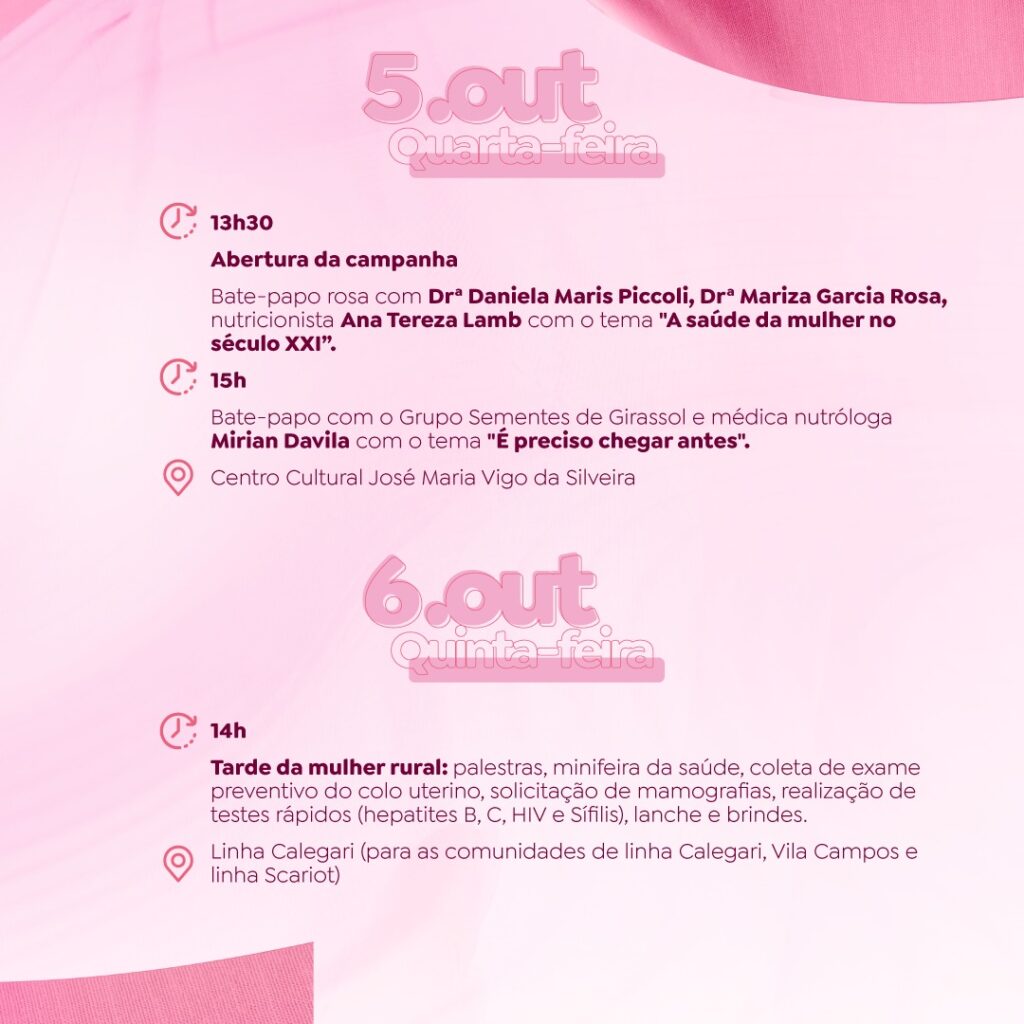 Os eventos alusivos ao Outubro Rosa, mês dedicado à prevenção e ao combate aos cânceres de Mama e de Colo de Útero, iniciam nesta quarta-feira (05), em Tapejara. A abertura da programação acontece no Centro Cultural José Maria Vigo da Silveira, a partir das 13h30. Nas imagens abaixo, confira mais detalhes sobre as ações preparadas para todo o mês. Participe!